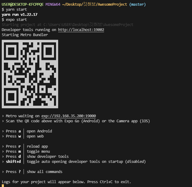 npm start 또는 yarn start하면 각종 개발환경별로 선택할수 있도록 활성화된다.