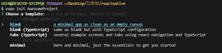 "AwesomeProject"라는 새로운 React Native 프로젝트를 생성하면 다음과 같이 선택창이 나온다.