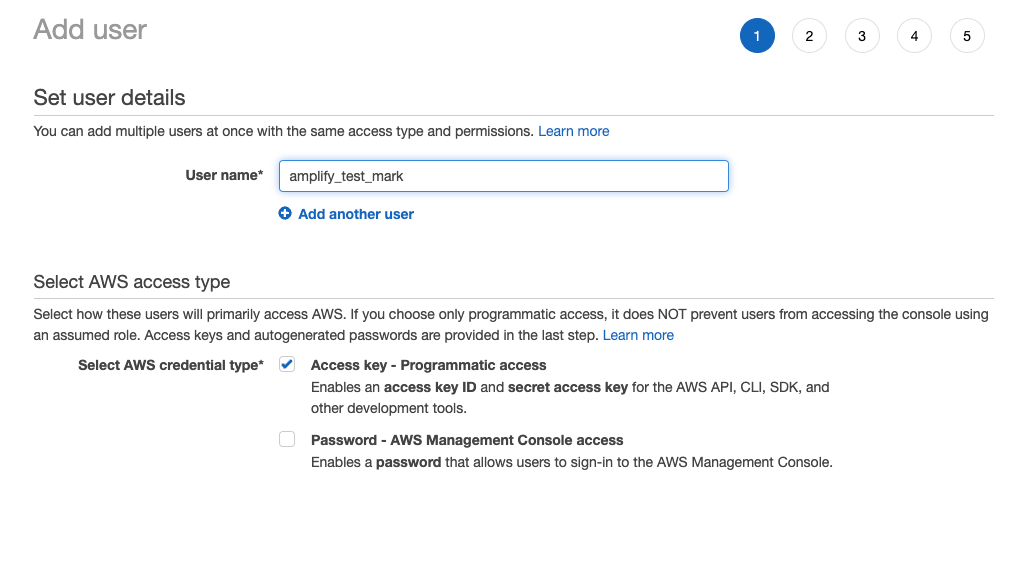AdministratorAccess 권한을 가진 IAM 유저를 만들면 Amplify CLI가 S3, AppSync, Lambda, cognito 등과 같이 Amplify에서 사용해야 하는 기타 AWS서비스를 사용할 수 있게 됨.