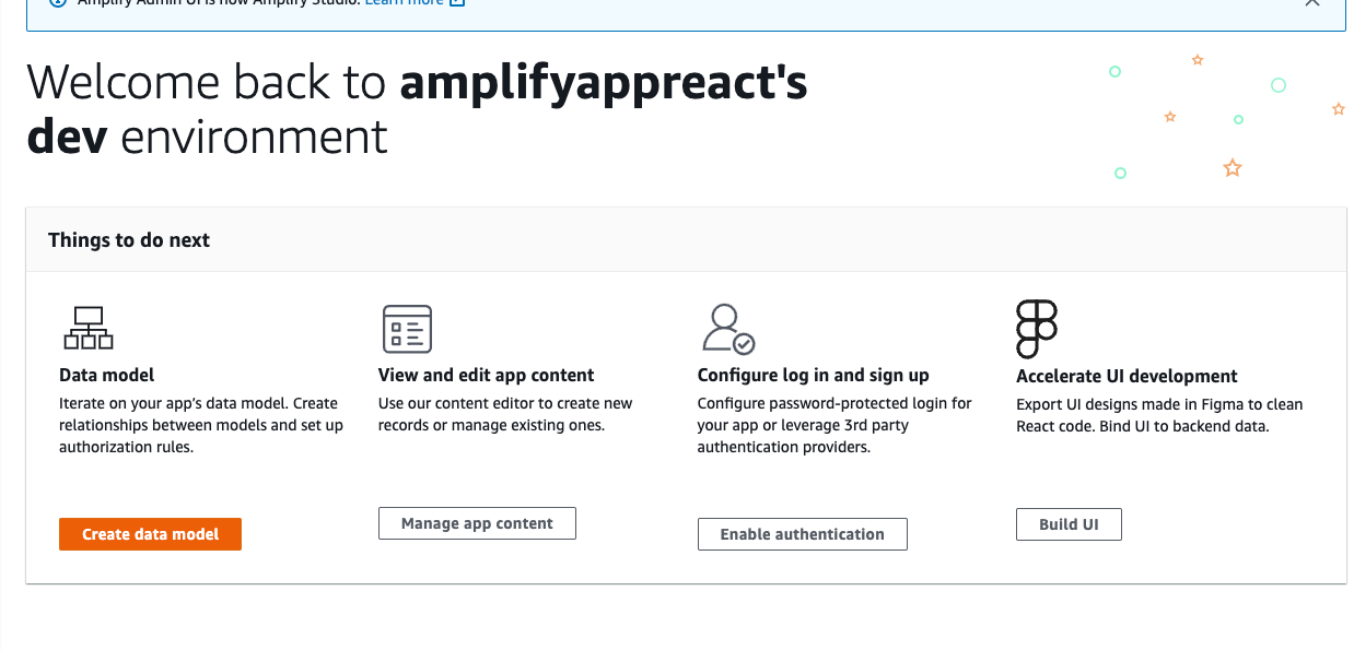 AWS 콘솔을 통해 Amplify Studio backend 사용을 미리 세팅했다면, 아래 명령어를 통해 쉽게 Amplify Studio로 이동가능함