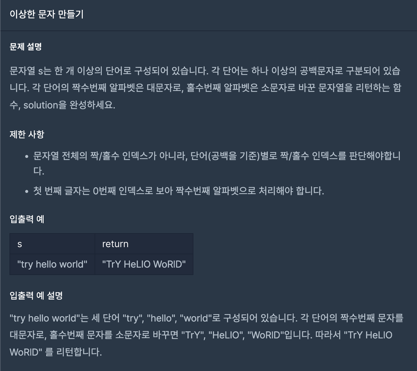 문자열을 배열로 만들고 루프 돌면서 짝수일 경우 대문자 홀수일 경우 소문자로 변환 후 문자열로 반환해서 풀었다.