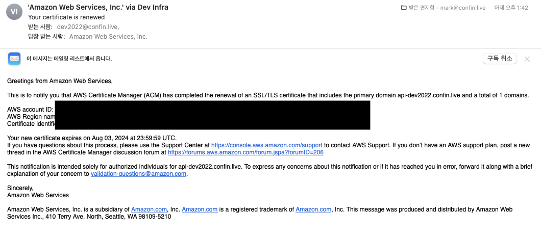 메일에서는 AWS Certificate Manager(ACM)에서 보유한 SSL/TLS 인증서가
