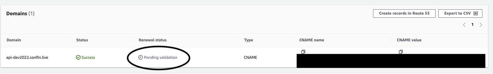 ACM의 표시된 도메인 매핑용 레코드를 제대로 등록하고 5분 정도 기다리면 정상적으로 상태가 처리된다.