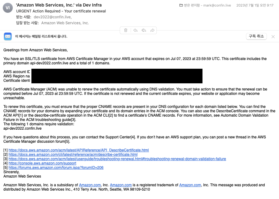 회사에서 운영 중인 AWS계정에 긴급히 처리해줄것을 권고하는 메일을 한통 받았다.