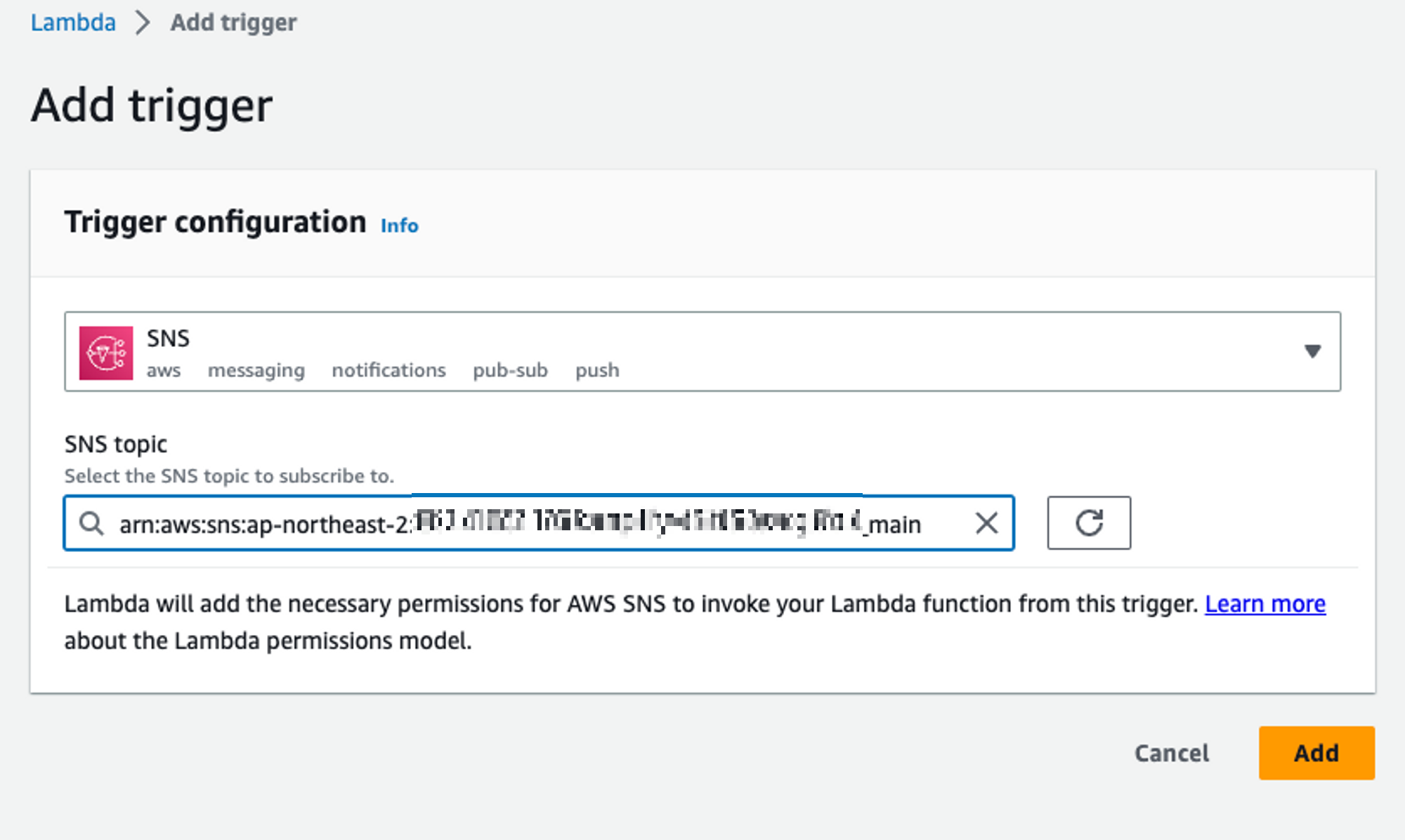 람다의 트리거 부분을 앞서 설정했던 sns topic으로 설정한다.