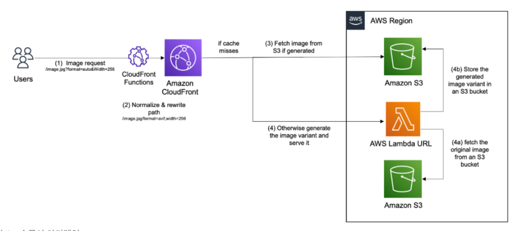 1) 이미지 요청하면 있을 때 cloudfront functions을 이용해서 요청한 쿼리값(너비, 높이등)을 확인.