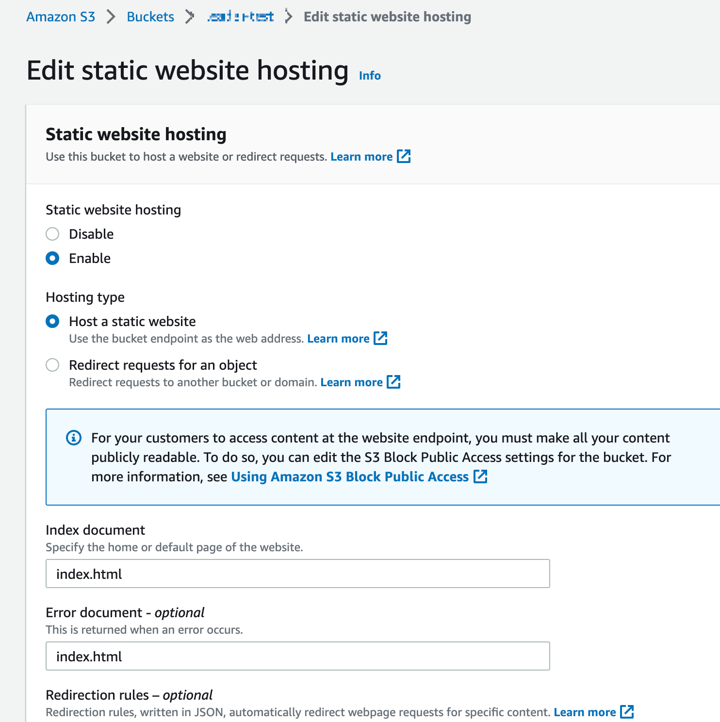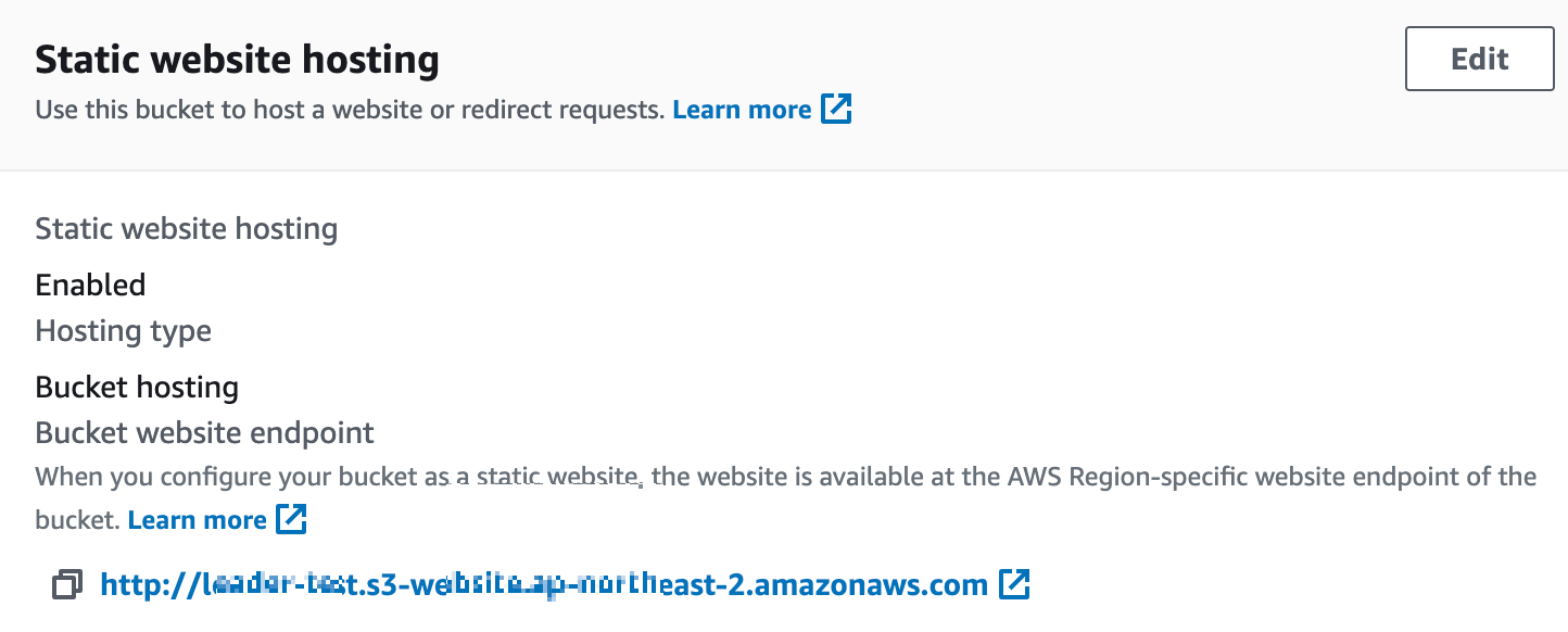 - S3 > bucket > 생성한 버킷명 > Properties > Static website hosting
