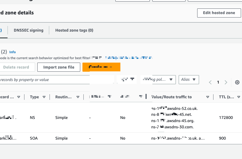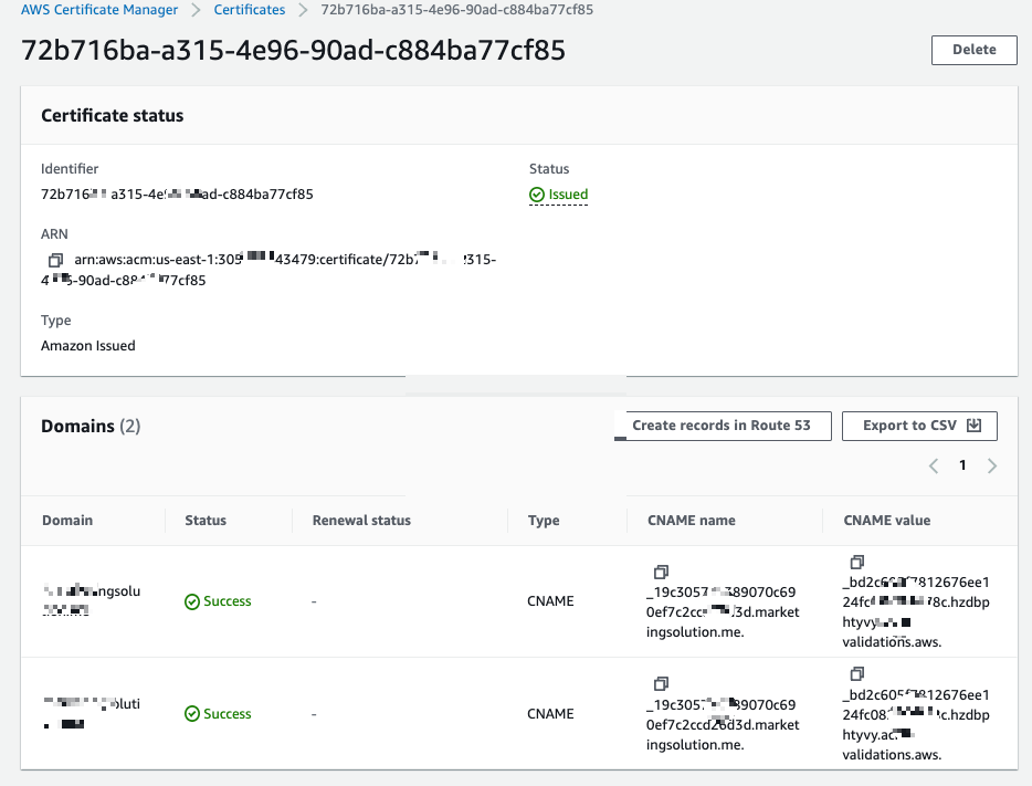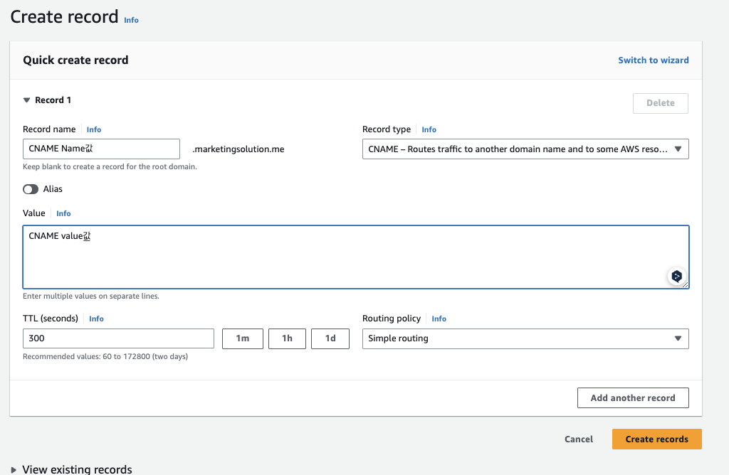 Route53을 이용할 경우 각 CNAME 값을 수동으로 등록해 주거나 Create records inRoute53을 통해 등록을 요청한다.