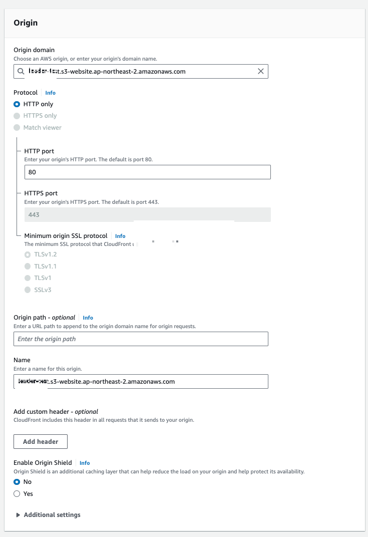 - Origin domain : 배포하려는 도메인을 선택해야 한다. 자동으로 s3호스팅이 되어있다면 아이템으로 선택할 수 있는데 정적웹호스팅의 경우 엔드포인트를 배포된 웹사이트 엔드포인트로 설정한다.