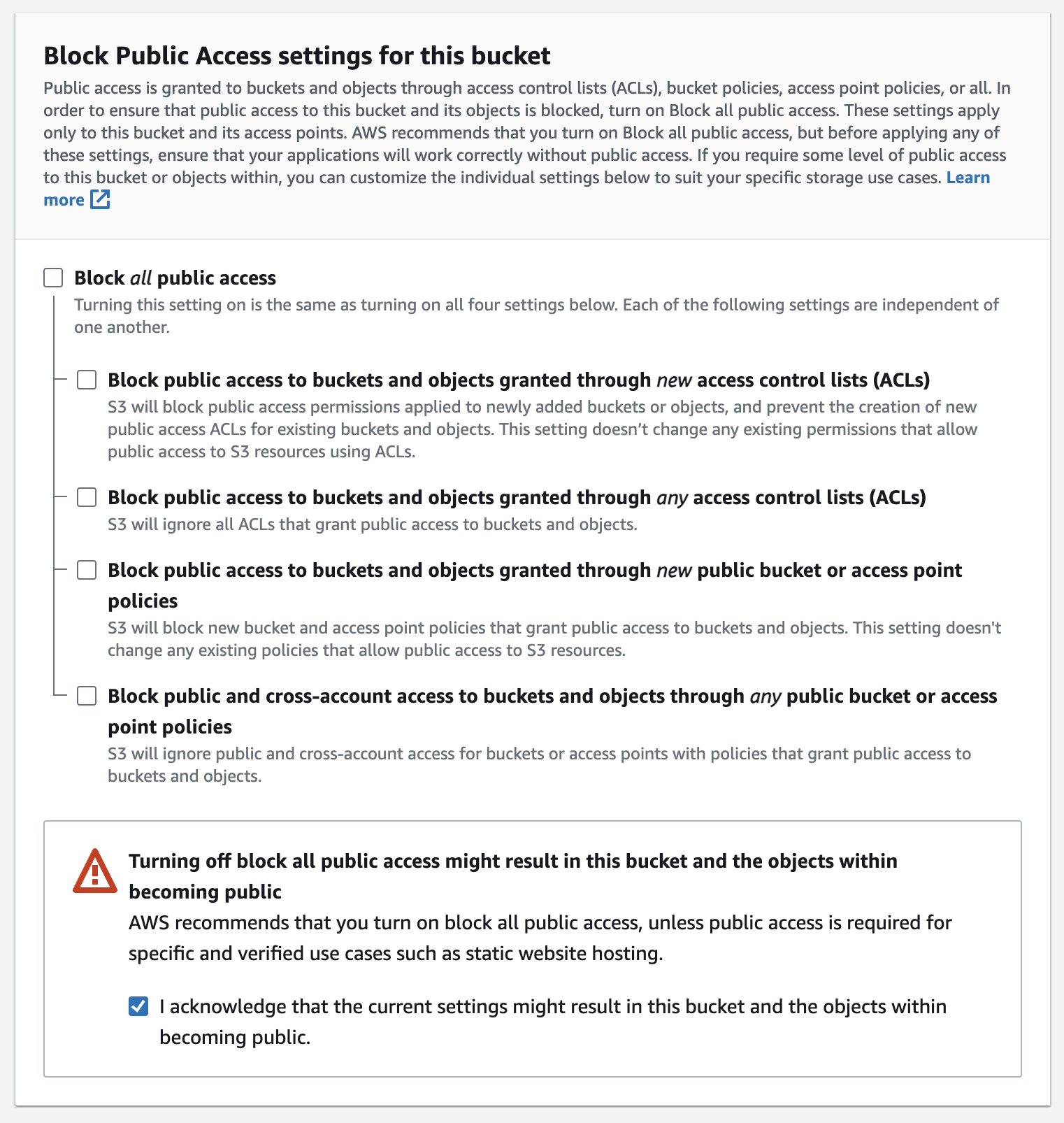 모든 퍼블릭 액세스 차단(Block all public access)을 선택 취소