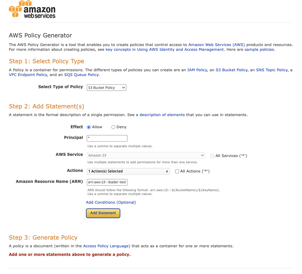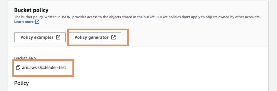 버켓 리소스를 복사해 두고(ARN) 정책생성기 선택