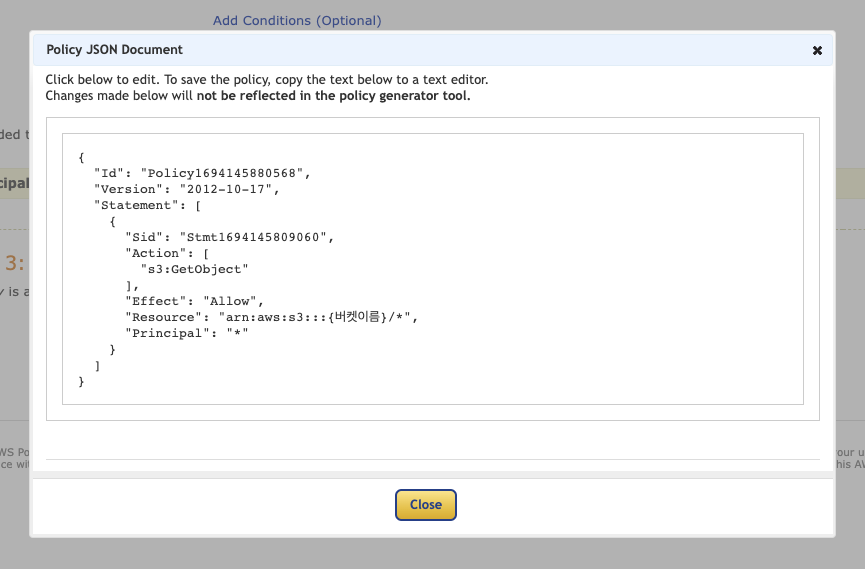- Actions : 주체가 어떤 작업을 수행하는지를 나타내는데 s3객체에 접근할 수 있도록 getObject권한을 부여한다.