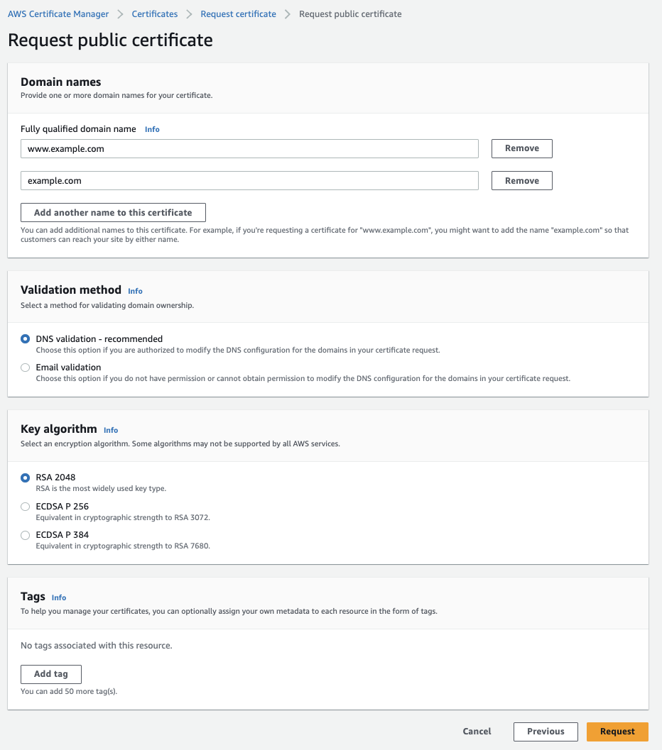 - Validation Method: 검증방법은 Route53을 통해 진행할 예정으로 DNS validation으로 설정