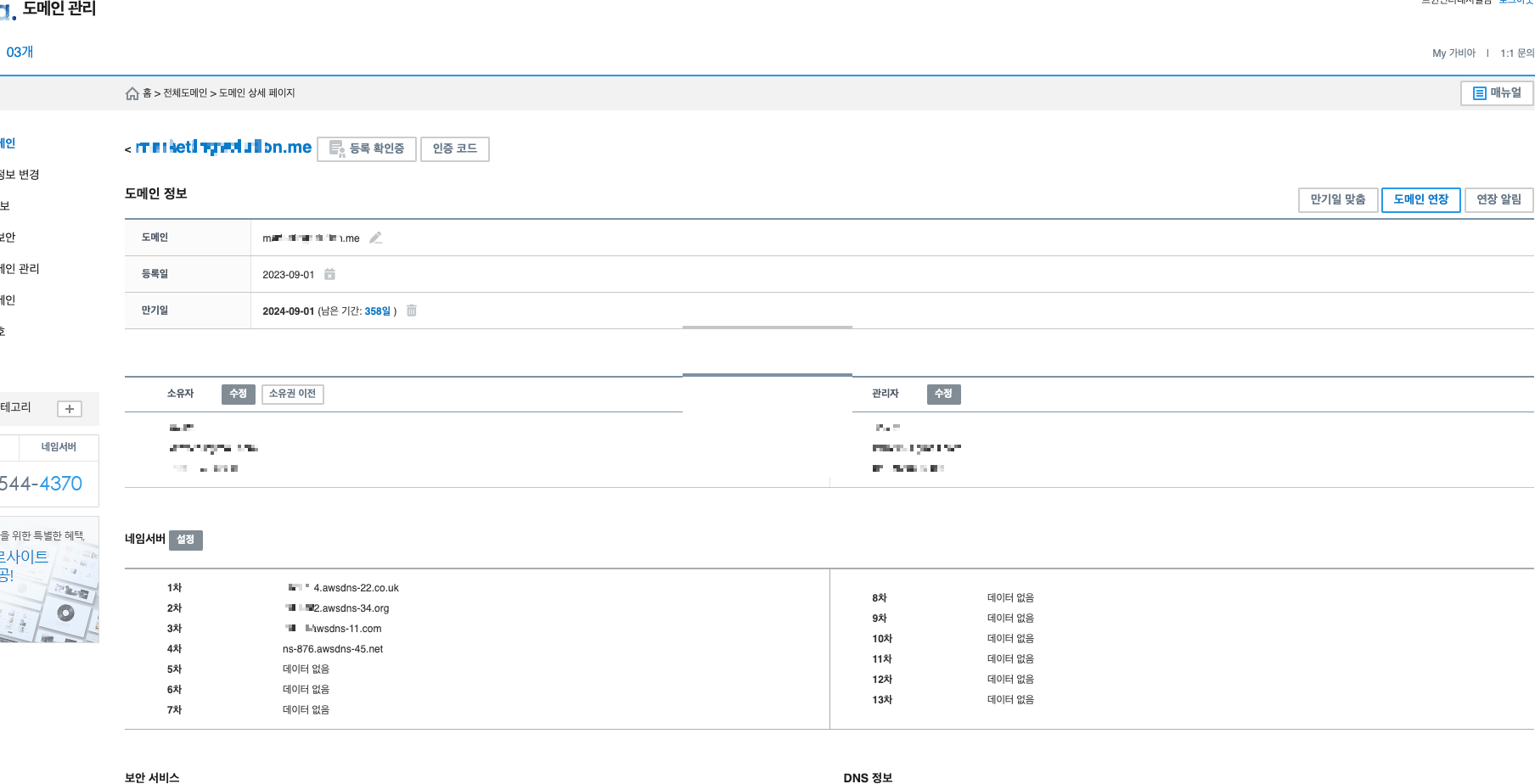 홈 > 전체도메인> 도메인상세페이지 > 네임서버 설정