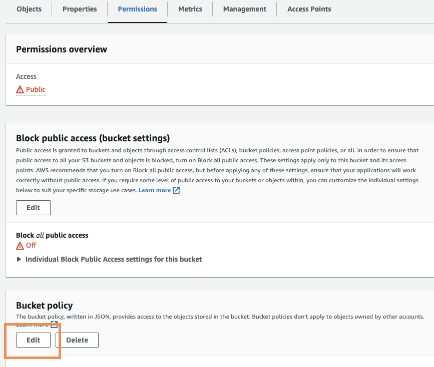 - 버킷의 객체를 공개적으로 읽기 가능하게 만들려면 모든 사용자에게 s3:GetObject 권한을 부여하는 버킷 정책을 작성해야 함