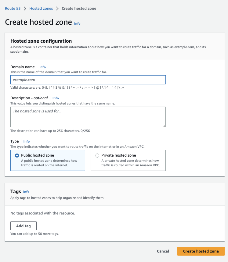 호스팅존이 만들어져있지 않았다면, 아래 단락처럼 Route53에서 호스트존을 만들고 진행한다.