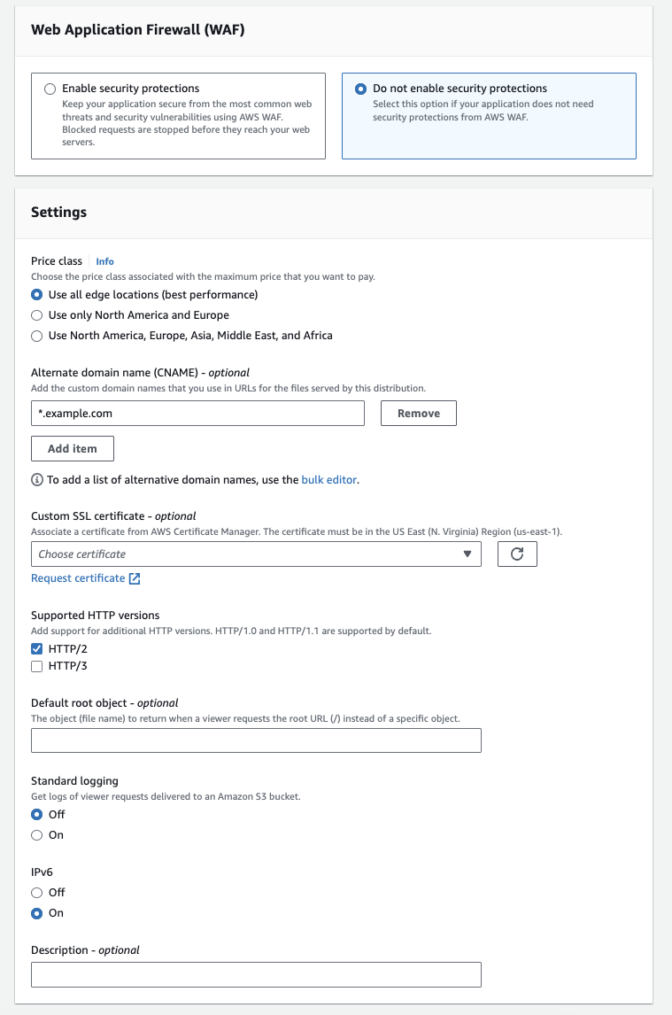 - Alternate domain name (CNAME) : 사용하려고 구매한 도메인을 입력한다. 만약 www.혹은 다른 서브도메인 붙이고자 한다면 구매한 도메인 앞에 와일드카드를 붙여준다. *. example.com