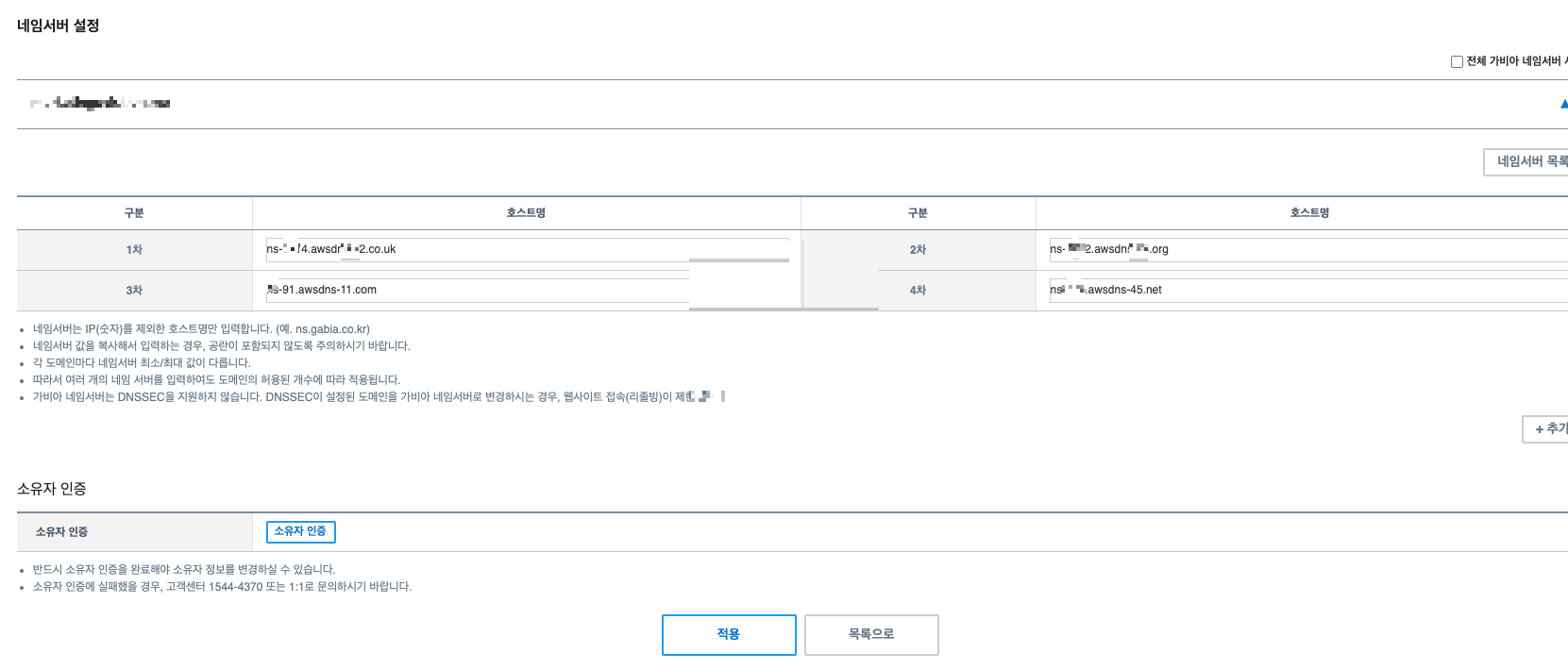 네임서버 설정에 Route53의 NS레코드 값을 하나씩 채워준다.