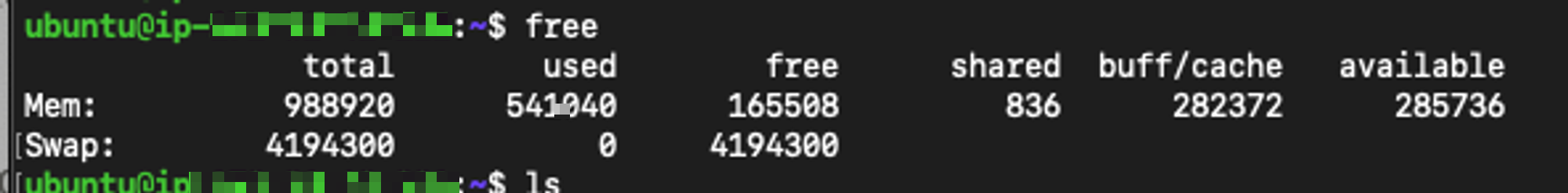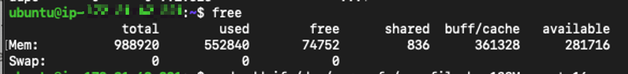 - 프리티어 구간 내에서 메모리를 최대한 확보할 수 있는 방법이 있는지 강구해 보고 없으면 인스턴스 클래스를 올려야 하는데 프리티어가 벗어난 인스턴스면 의미 없음→ 클라이언트는 더 이상의 비용지출을 원하지 않음
