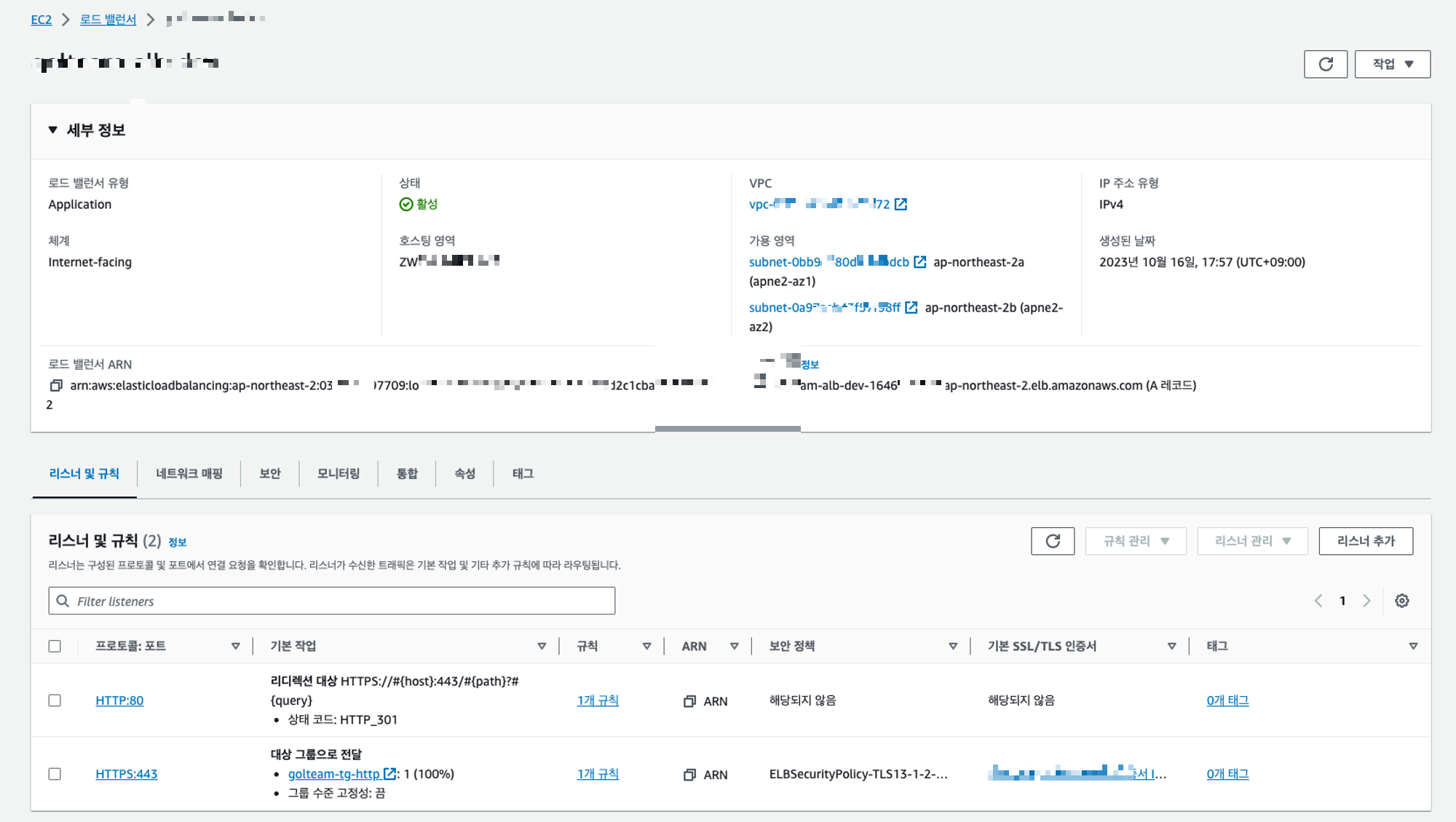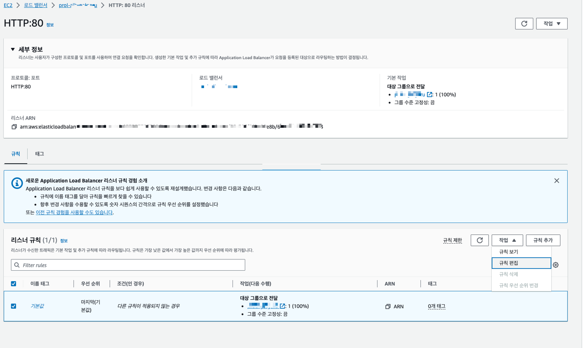 - 80 포트 리스너 라우팅 대상그룹 → 인스턴스 http 80포트